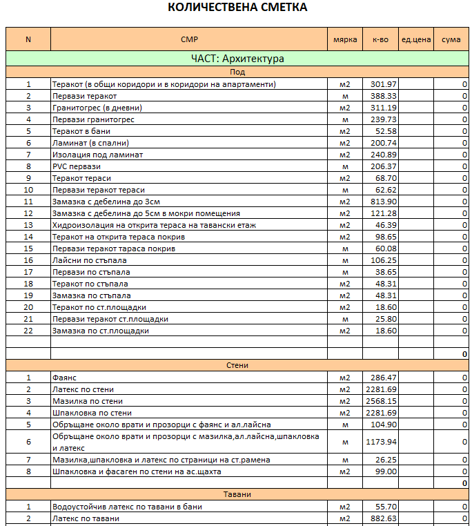Изготвяне на количествени сметки по част Архитектура за всички видове сгради.