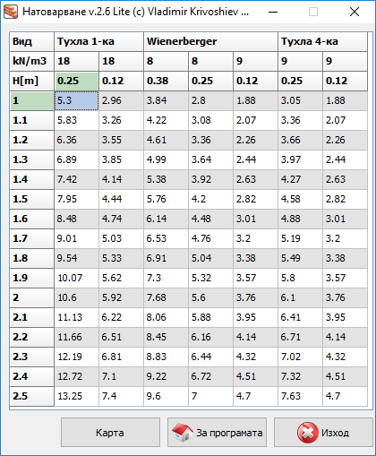 Натоварване от зидове за 1м линеен за различни видове тухлени блокове