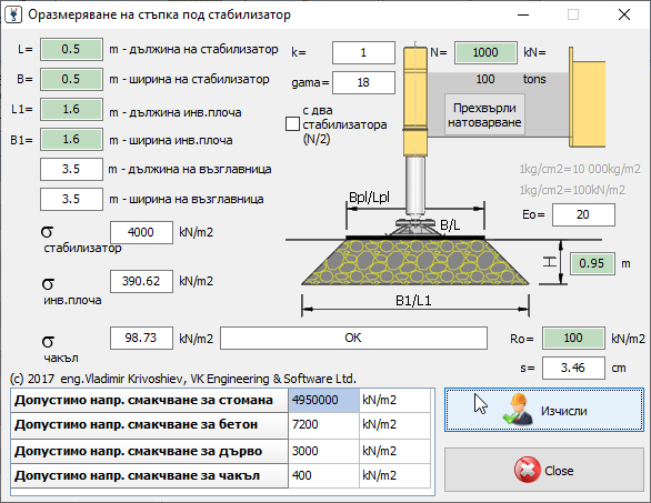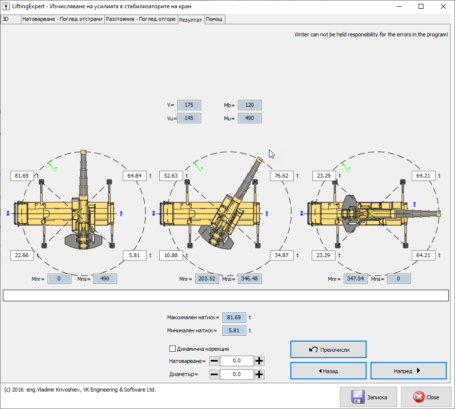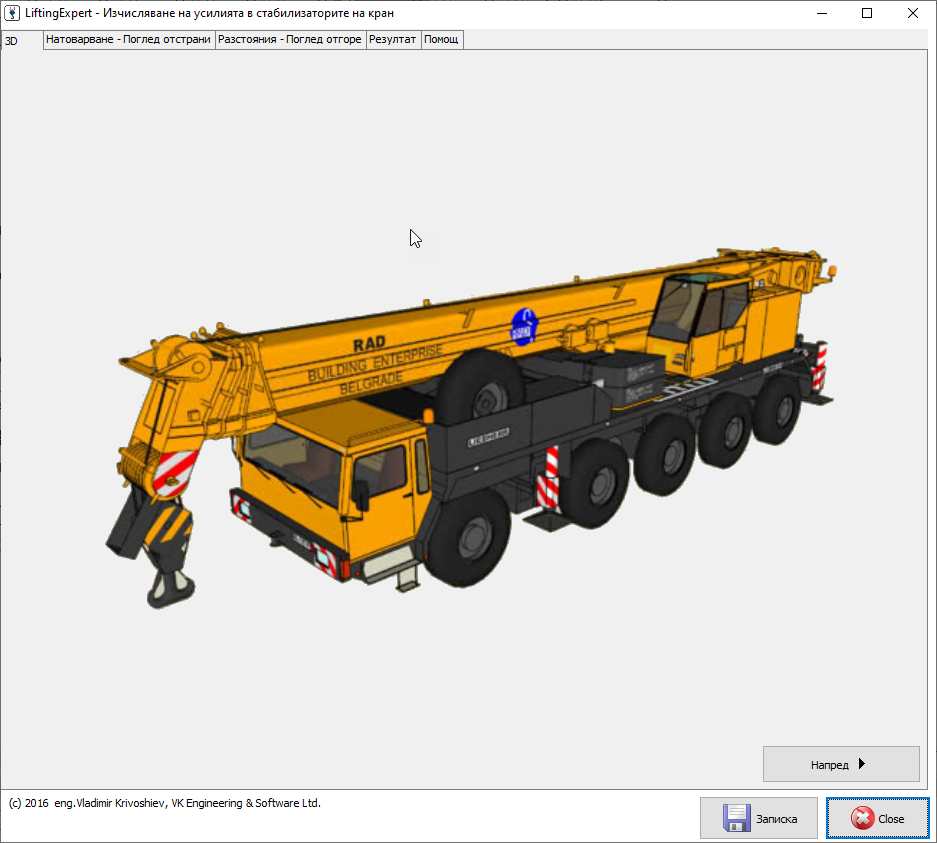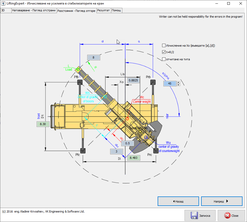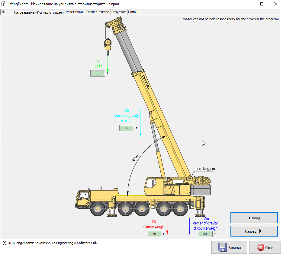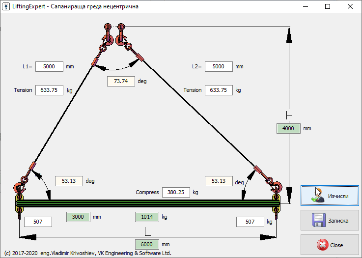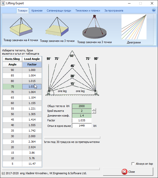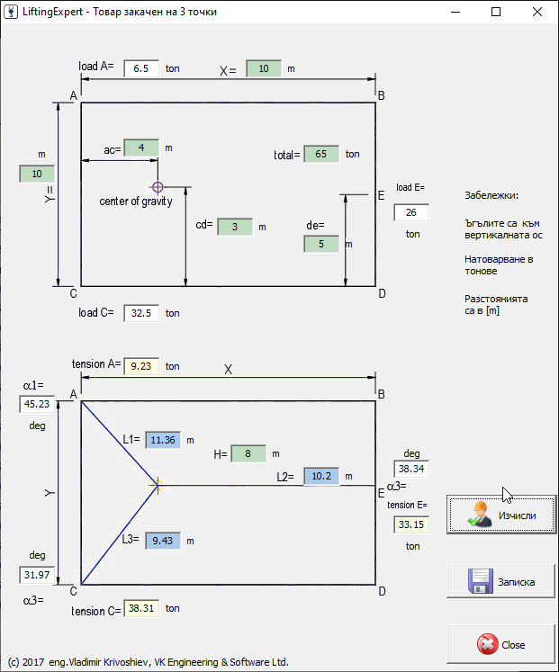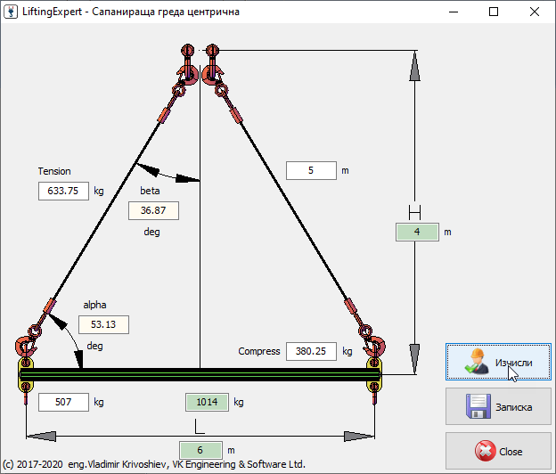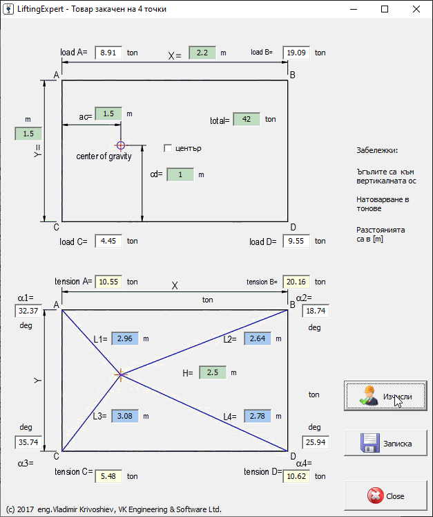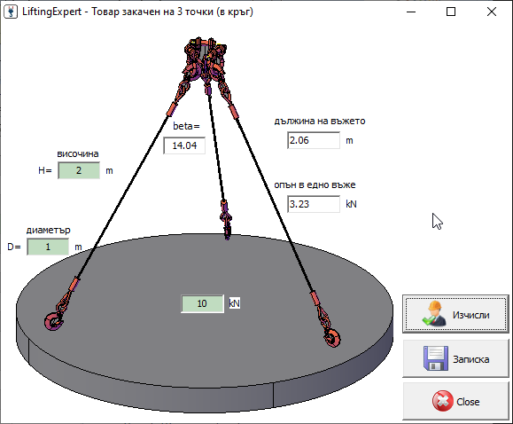 Lifting Expert v3.1Изчисляване на товар закачен на 4 точки.Изчисляване на товар закачен на 3 точкиИзчисляване на товар закачен на 3 точки (кръг)Изчисляване на сапанираща центрично закачена гредаИзчисляване на сапанираща нецентрично закачена гредаНосимоспобоност на ухо за повдигане (lift lug)Носимоспобоност на заваръчен шевУсилия в стабилизатори на кранОразмеряване на чакълена възглавница под стабилизатори на кранКонзолен кран с обтегачКонзолен кран подпрян