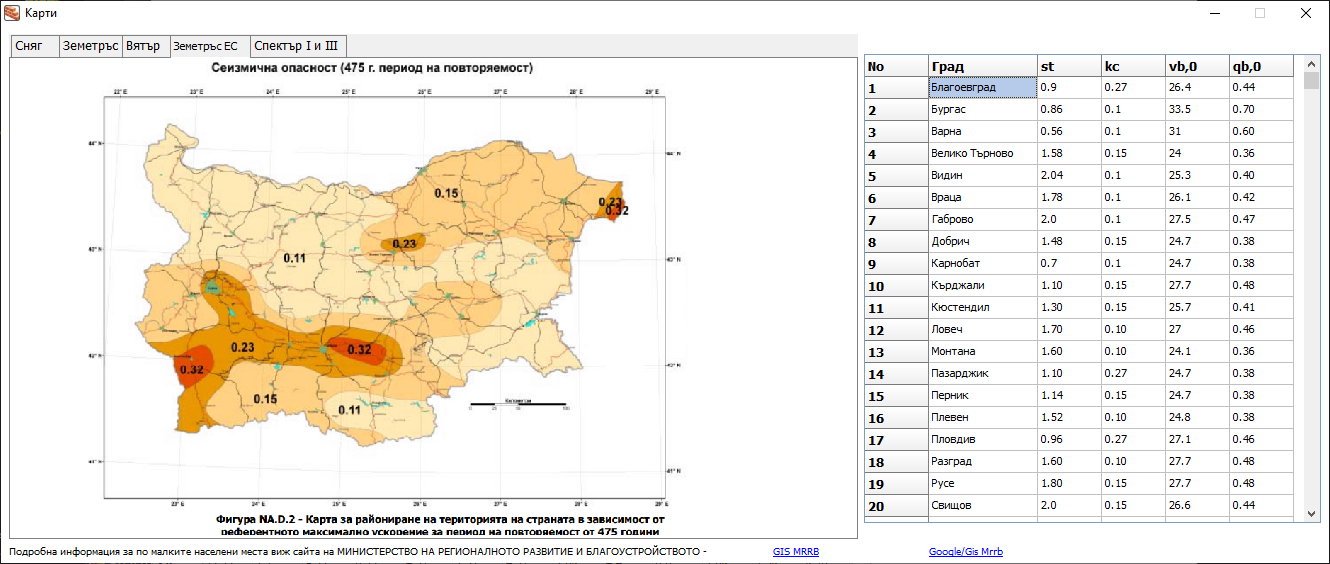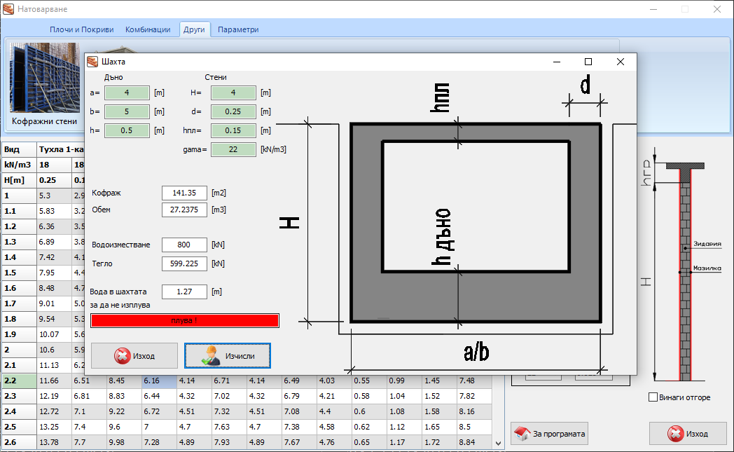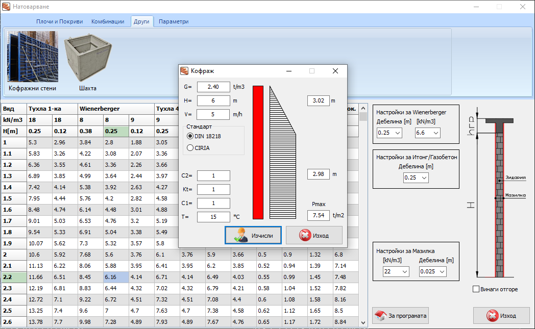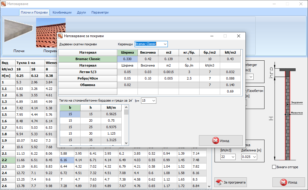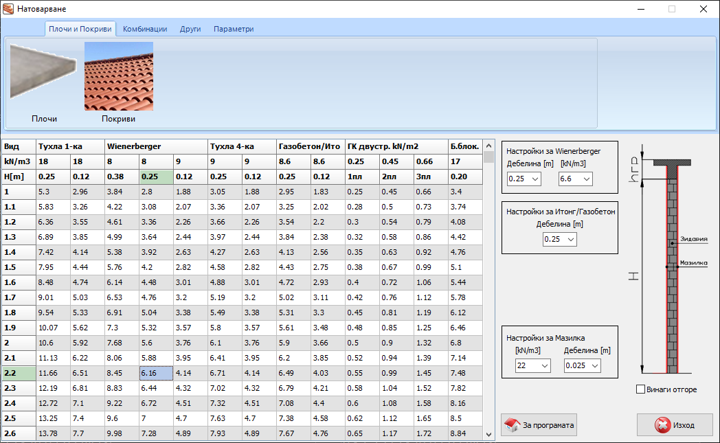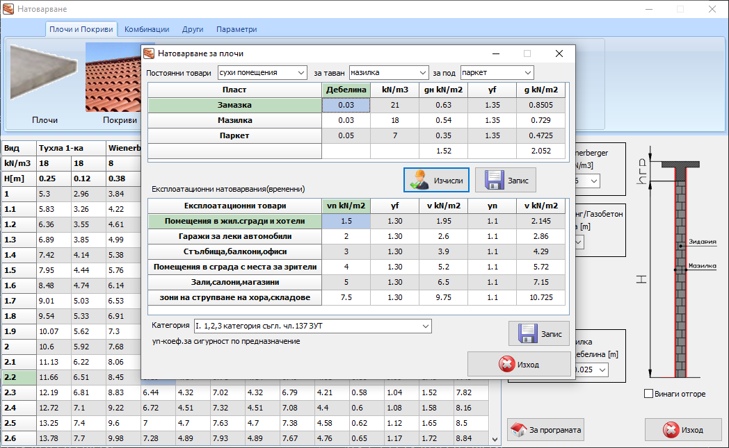 Натоварване - v3.0Натоварване от зидове за 1м линеен за различни видове тухлени блоковеТухла 1-ка, Тухла 4-ка, Wienerberger, Газобетон за [12,5] ,[25]см и по избор.Натоварване от ГК стени за 1м линеен за щендерни стени двустранни с 1,2,3 слойни плочи.Натоварване на плочи.Експлоатационно натоварване на плочи.Натоварване на покриви.Натоварване от стоманобетонни греди и бордове.Коефициенти.Добавена карта за натоварване сняг/вятър/земетръс за територията на БългарияИзчисляване на натоварването от бетон по стените на вертикален кофражИзчисляване на водоизместването на стоманобенно шахта, количество за бетон и кофраж.Изчисляване на необходимото запълване с вода за да не плуваКоефициент на значимост за земетръс.
