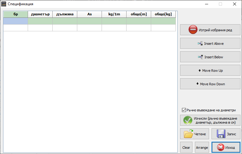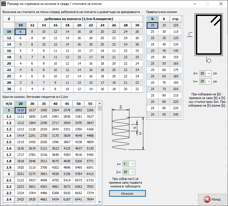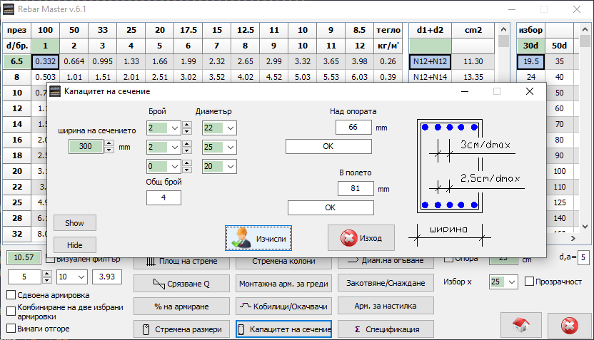 Rebar Expert v6.0Основен прозорец - дава информация за площ на армировъчна стомана от Ф6,5-Ф32за 1бр до 12бр и теглото за метър линеенИзползване на филтър за ориентация кои армировки надвишават зададената площПлощ на напречните сечения на армировката с кръгло сечение.Комбиниране на две избрани площи на армировка.Кратност на закотвяне - зададени и по избор.Визуален филтър.Закотвяне на армировка за греди при зададена ширина на опората.Капацитет на сечение-корекция размери в [mm].Носимоспособност на кобилици,окачвачи и монтажни куки.Дължина на стремена за правоъгълни колони.Дължина на спирали за кръгли колони.Поемане на напречни сили.Площ на стремена.Закотвяне / Снаждане на армировка.